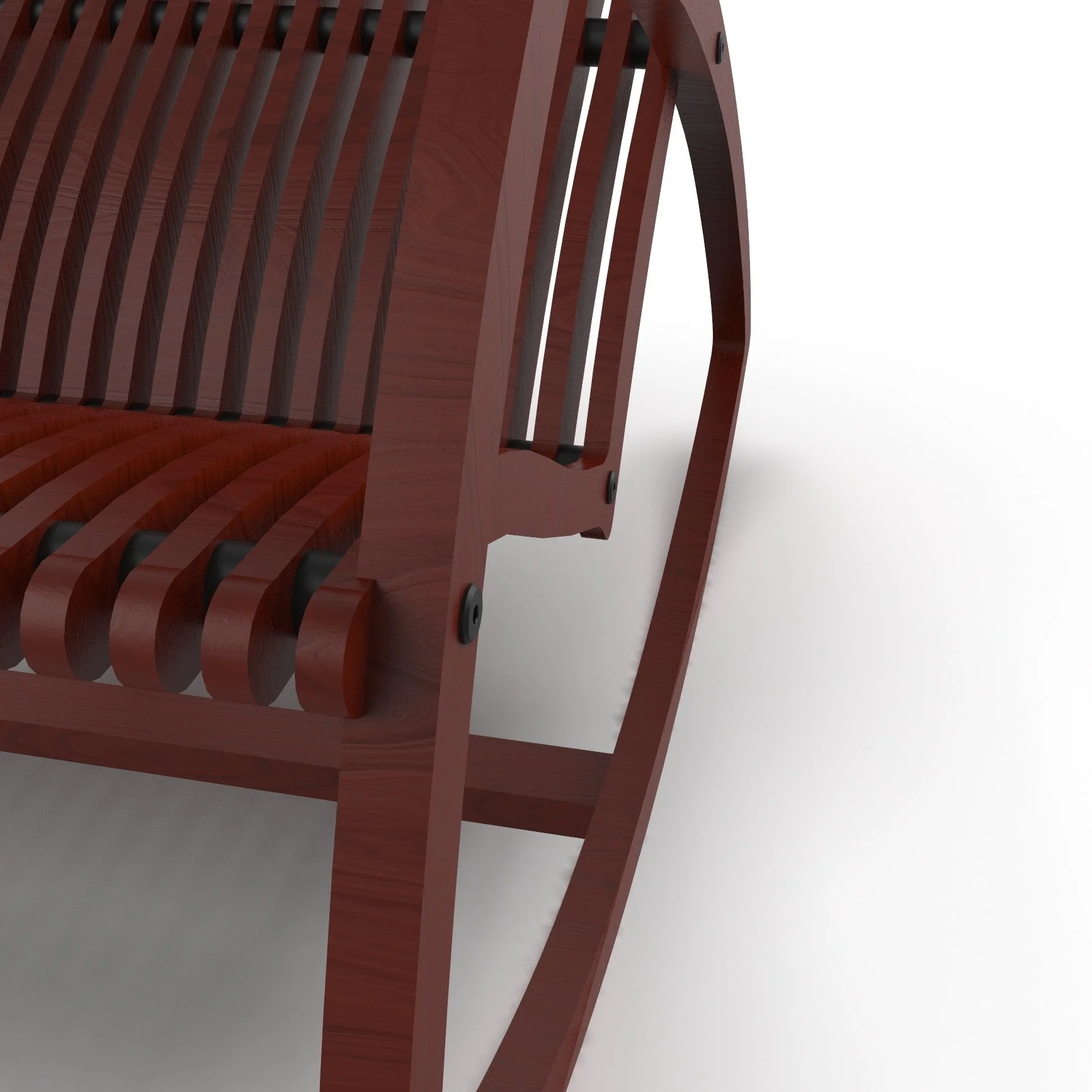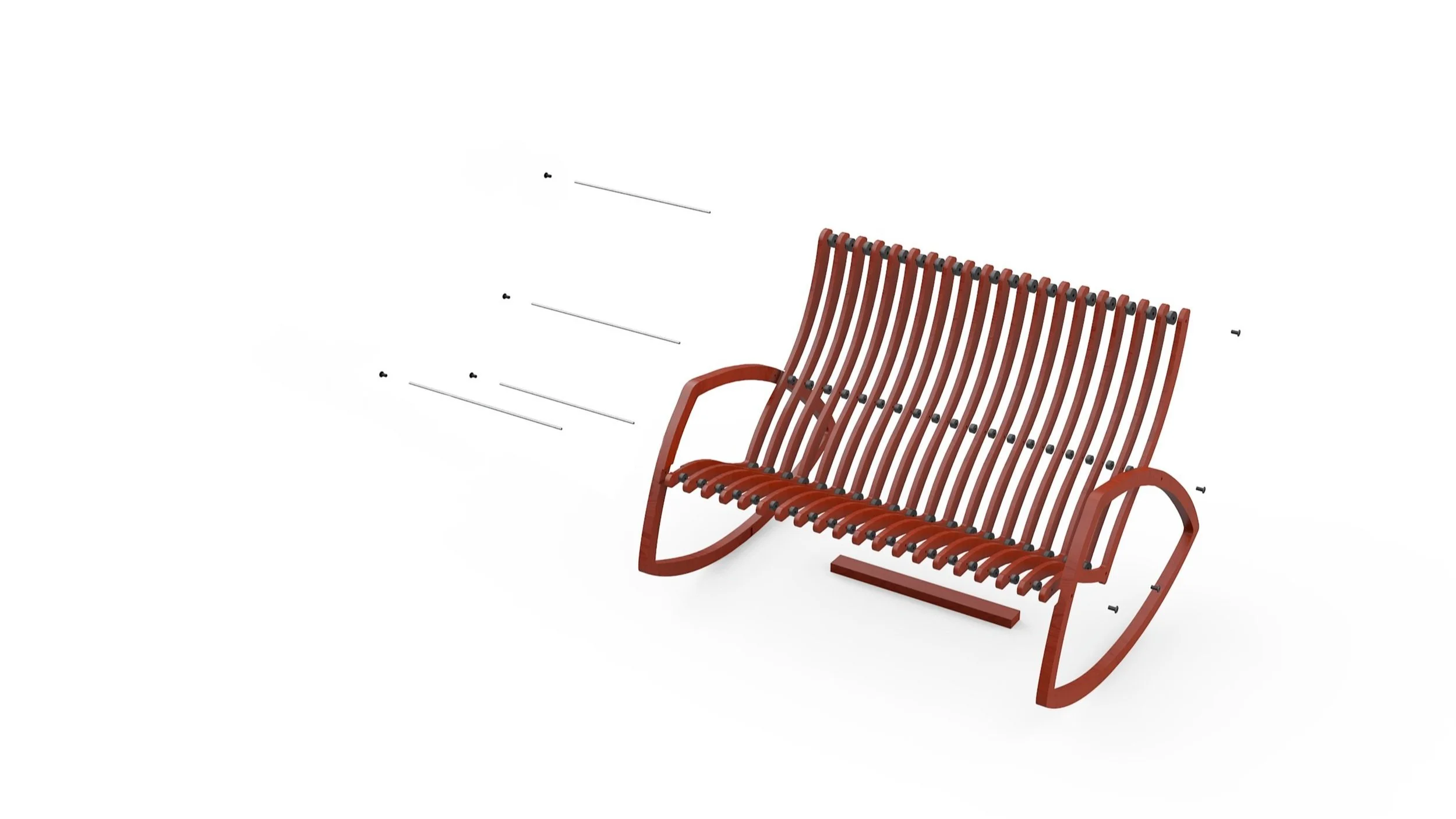 The Rocker has a total of 23 wooden pieces, 76 spacer pieces, 4 Galvanized Steel threaded rods, and 8 Binding Black-Oxide Steel Barrels. The assembly only requires inserting the wooden pieces and spacers through the rods and having the two end pieces align with their corresponding rocker pieces. It’s made of environmentally sustainable bamboo plywood at a tensile strength of 28,000 per square inch.