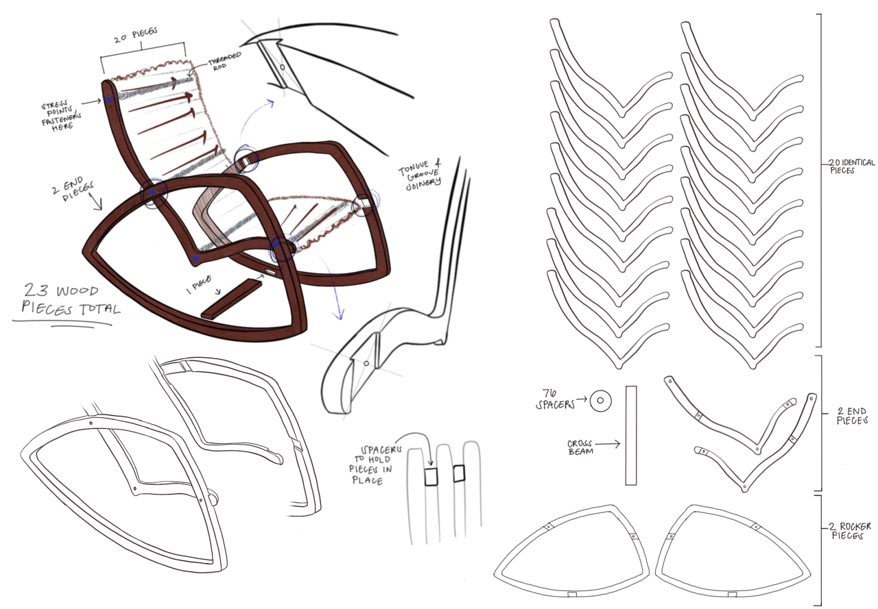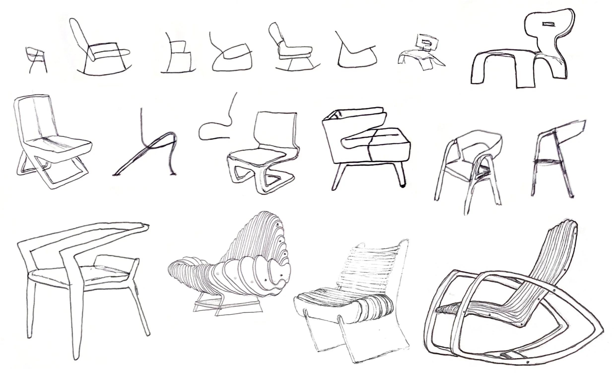 Sketches of chair designs that explore the aesthetic development and feasibility of manufacturing with CNC milling technology.